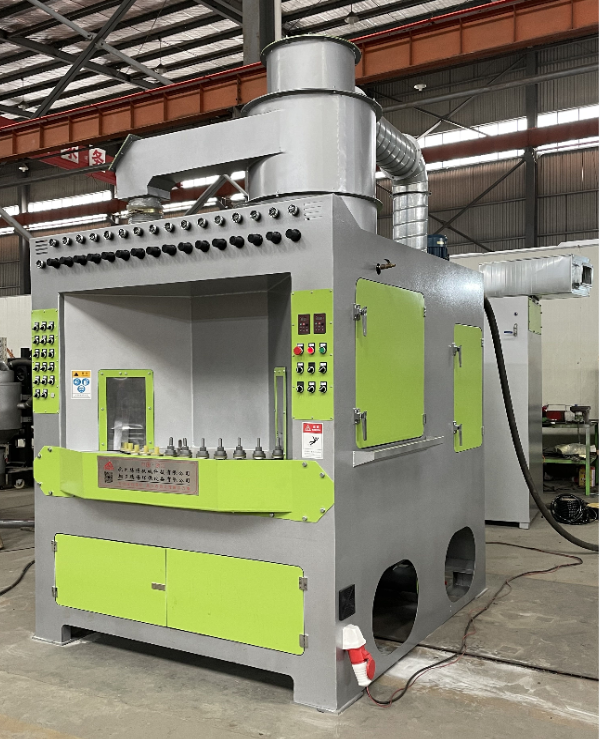 該自動(dòng)噴砂機(jī)(可按客戶要求定制),主要用于處理回轉(zhuǎn)體工件的自動(dòng)噴砂機(jī),設(shè)1個(gè)大轉(zhuǎn)盤,大轉(zhuǎn)盤上設(shè)置8個(gè)小轉(zhuǎn)盤,針對小直徑工件可在小轉(zhuǎn)盤上設(shè)置復(fù)合多工位小轉(zhuǎn)盤,本機(jī)共分4個(gè)區(qū),分別為上下件區(qū)、第一隔離區(qū)、噴砂區(qū)、第二隔離區(qū)(吹凈區(qū)),每個(gè)區(qū)設(shè)兩個(gè)小轉(zhuǎn)盤,大轉(zhuǎn)盤轉(zhuǎn)動(dòng)90°區(qū)域一停,工件由上下件區(qū)裝夾在小轉(zhuǎn)盤上,大轉(zhuǎn)盤轉(zhuǎn)動(dòng)帶動(dòng)小轉(zhuǎn)盤和工件進(jìn)入噴砂區(qū),小轉(zhuǎn)盤在噴砂區(qū)自動(dòng)旋轉(zhuǎn),噴槍往復(fù)擺動(dòng)或移動(dòng)對工件進(jìn)噴砂加工,保證了工件噴砂均勻;配置我公司多年經(jīng)驗(yàn)專業(yè)設(shè)計(jì)的上旋風(fēng)分離器,分離效果好,精度高,無級可調(diào);配置獨(dú)立的氣動(dòng)振打清灰布袋除塵器,也可根據(jù)用戶要求配置下沉流脈沖反吹清灰濾筒除塵器,除塵效果好,達(dá)到國家環(huán)保排放標(biāo)準(zhǔn);本機(jī)采用成熟可靠的先進(jìn)技術(shù)。